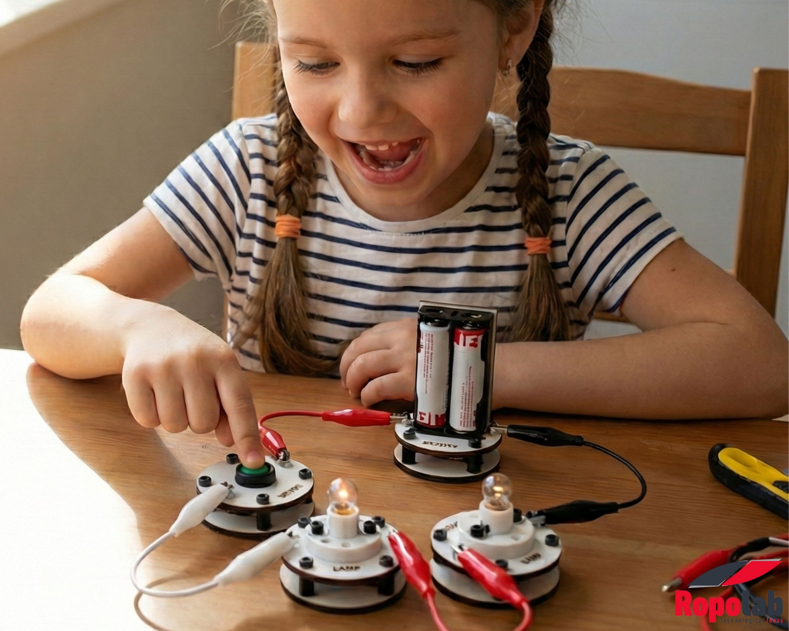 This educational electronics kit helps kids learn how real circuits work by building them step-by-step using safe and easy-to-connect components.
